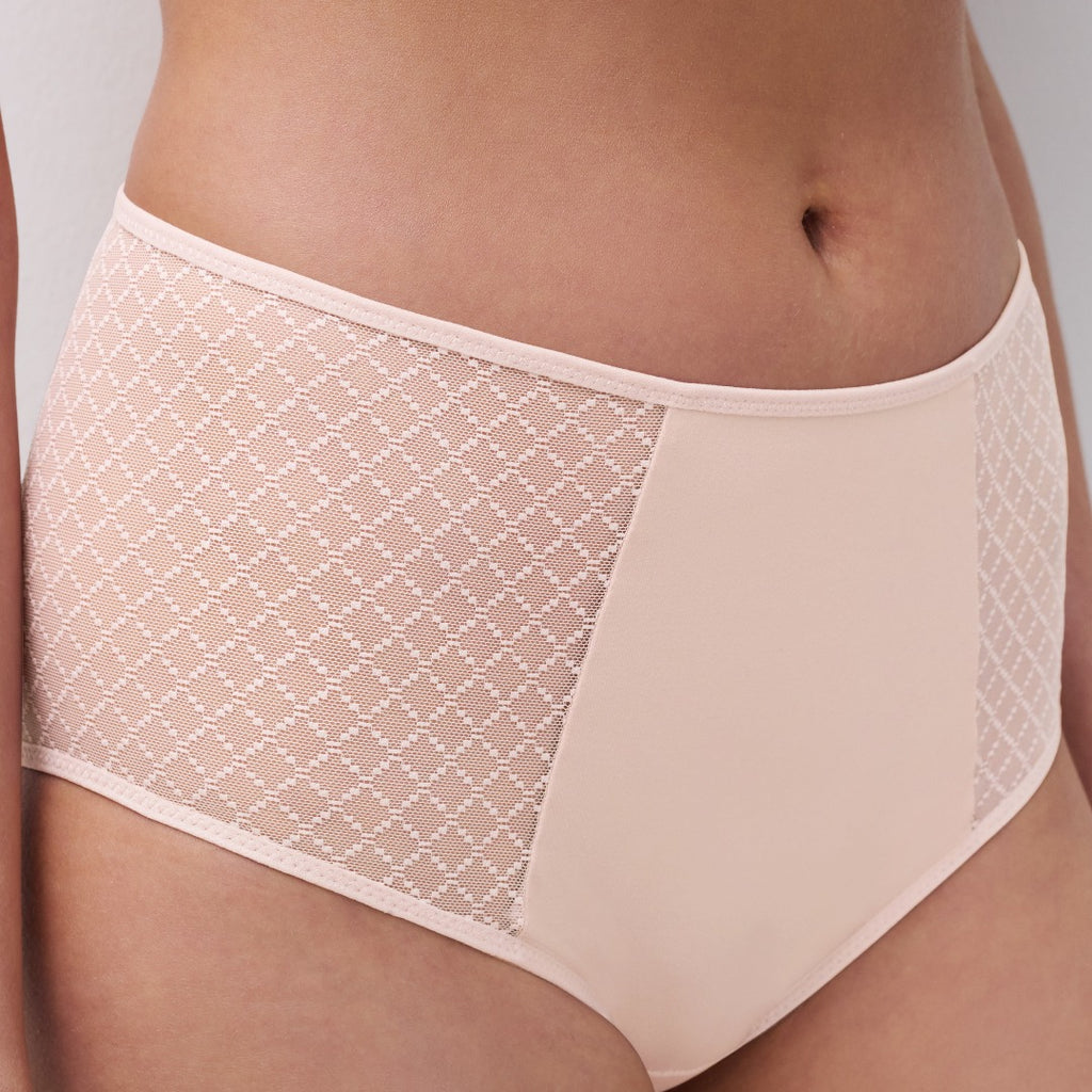 The Chantelle Norah Chic High Waist Full Brief offers elegant support with its high-waisted design that gently hugs the figure for everyday comfort. Crafted with a soft, opaque knit front and back, it ensures a smooth silhouette, while refined graphic tulle panels on the sides add a touch of sophistication. Featuring a 100% GOTS-certified cotton gusset, this French-designed brief combines luxury with thoughtful comfort for a refined lingerie experience.