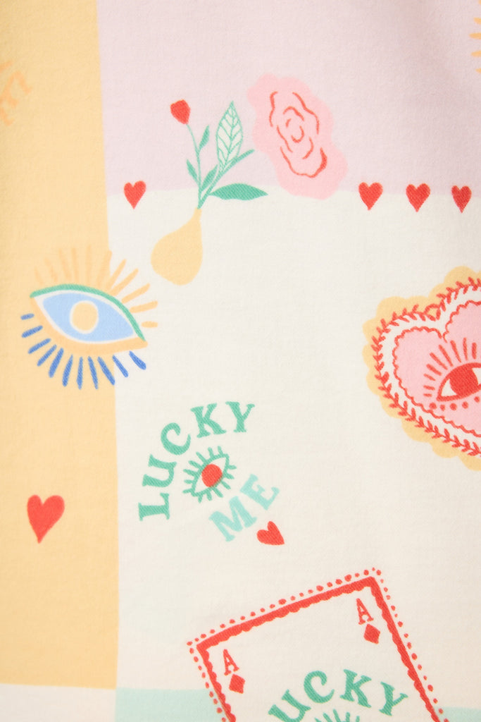 A winning hand for cozy days. This ivory pajama set—crafted from a soft cotton flannel—pairs a button up top with straight leg pants in an allover print of whimsical playing cards, hearts, lucky eyes, and sweet little charms. Just right for curling up with a book, sipping tea, or dealing out a round of cards with friends.