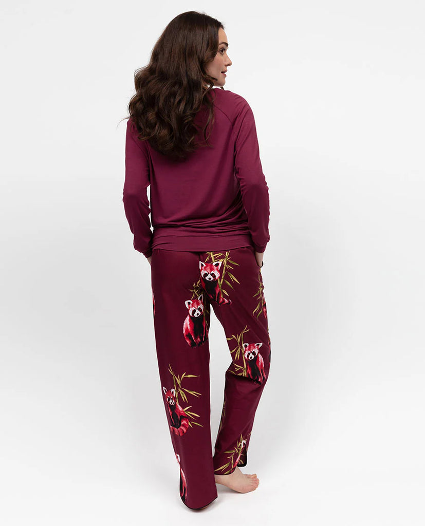 When the day is done and there's nothing left on your list, this pajama set is your cue to take things slowly. Cozy, coordinated, and full of quiet personality, this pajama set combines a slouchy long sleeve top with relaxed wide-leg bottoms - a gentle invitation to slow down. The slouchy top is made from a stretch jersey blend in deep burgundy, designed with a round neckline and cuffed sleeves for the kind of casual comfort you’ll live in come evening. The bottoms are cut in lightweight cotton-modal and printed with red pandas and bamboo shoots - a quiet, playful pattern that encourages you to let go and unwind. An elasticated back waist, drawstring front, and two easy pockets add just the right touches of practicality to an otherwise purely feel-good piece.