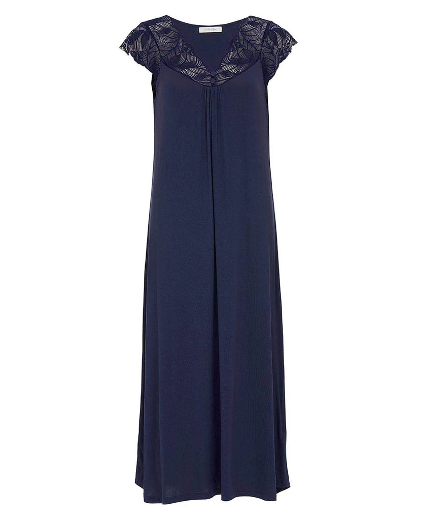 Comfy on the skin for easy unwinding? Tick. A flattering silhouette designed to fit all body shapes? Also tick. Get all of your bedtime boxes ticked with this Caroline Long Nightdress. This nightdress is crafted from a beautifully soft blend of 95% modal and 5% elastane for easy movement you can rely on from dusk to dawn. Cap sleeves form a gentle V-shaped neckline, with delicate leaf-patterned lace across the front yoke. Soft gathers fall from the lace into a relaxed drape, creating shape without clinging. The rounded back neck and self-folded hem add polish to a silhouette that flatters while allowing room to breathe. Finished with navy modal trims, this piece has thoughtful details at every seam. With all of your bedtime boxes ticked you can be sure your evenings will be made all the more comfortable with this nightdress.