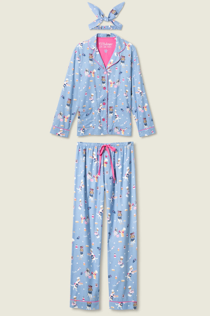 Sleep, lounge, repeat in this dream of a three-piece flannel set. Made from soft cotton in a classic twill weave, it includes a button-up shirt, relaxed-fit pants, and a matching headband to top things off. The soft blue fabric is sprinkled with pups baking cupcakes, plus playful paw prints and kitchen doodles—bringing a lighthearted touch to your bedtime lineup.