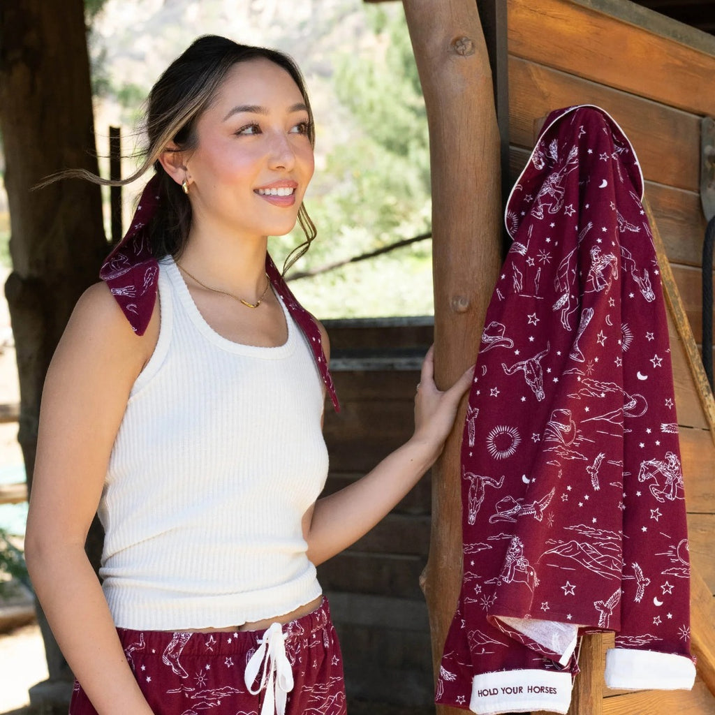 Sleep, lounge, repeat in this cozy three-piece flannel set with a free-spirited, Western twist. Made from soft cotton in a classic twill weave, it includes a button-up shirt, relaxed-fit pants, and a matching headband. The rich burgundy fabric is stenciled with desert-inspired motifs—riders on horseback, cowboy hats, horseshoes, soaring birds, stars, and mountain ranges—for a look that feels like drifting off under open skies.