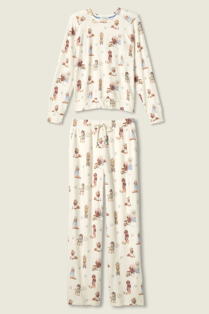 Round up some cozy charm. This ivory pajama set—crafted from soft peachy jersey—pairs a scalloped long sleeve top with relaxed drawstring pants, both in an allover western dog print with cowboy hats, boots, guitars, horseshoes, and playful pups ready for the rodeo. A perfect match for lazy mornings or curling up after sundown.