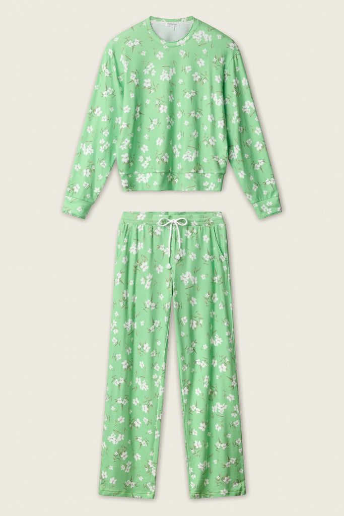 • Soft peach jersey featuring a relaxed long sleeve top and straight-leg pants with a drawstring waist and white blossom print.