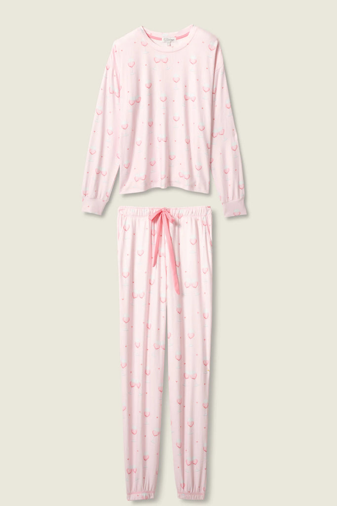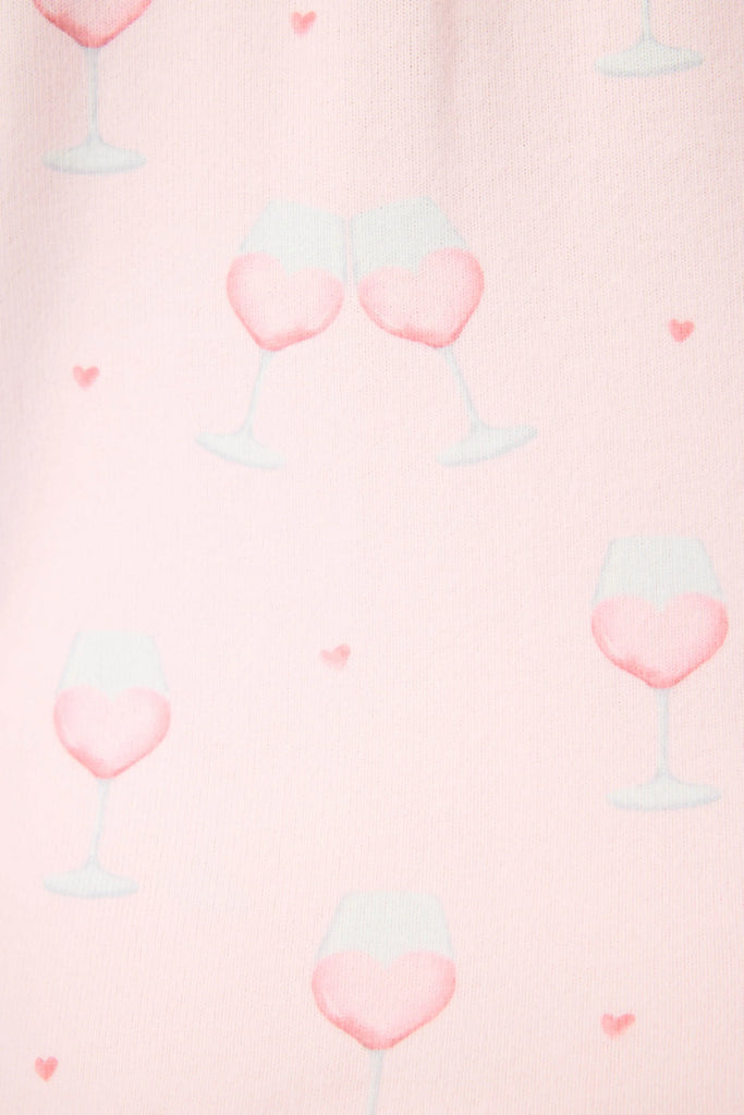 Playful and pretty in light pink, this two-piece pajama set toasts to love, comfort, and cozy nights in. Crafted in ultra-soft butter jersey, it includes a relaxed long-sleeve top and matching banded pants patterned with heart-shaped wine glasses—a sweet, cheeky combo for lounging and unwinding.