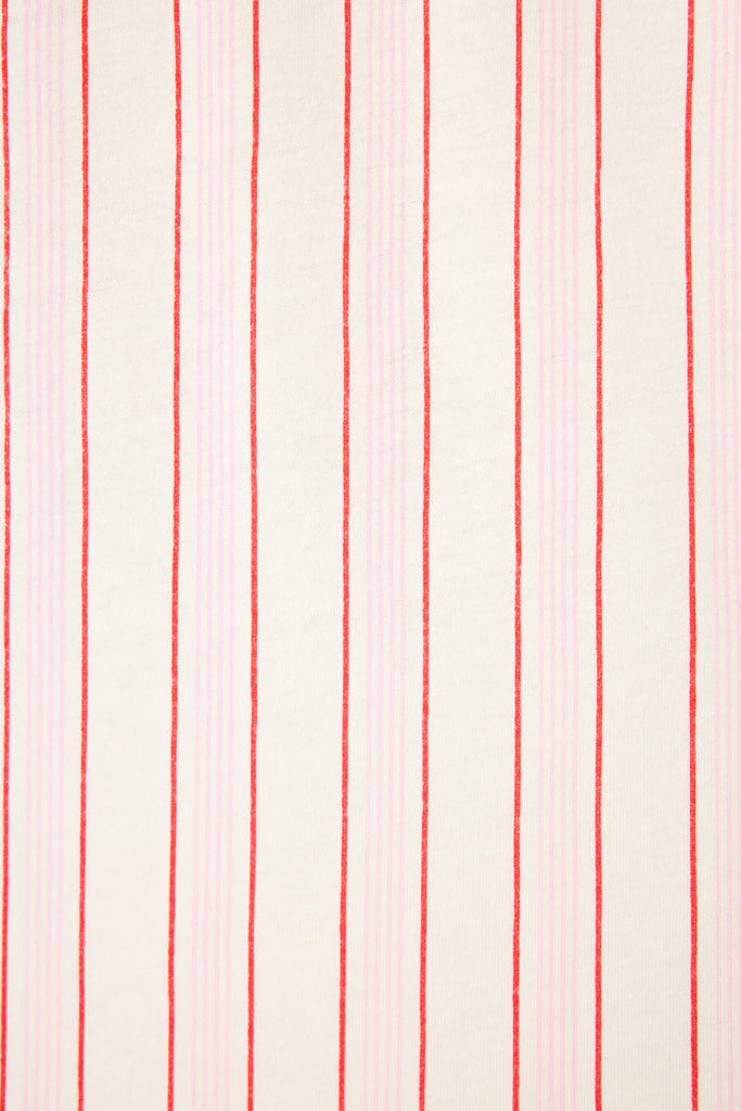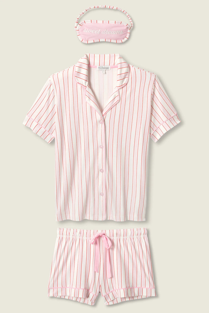 Ivory, red, and pink stripes bring a playful twist to this striped three-piece pajama set. Crafted in soft cotton-modal jersey, it includes a short-sleeve button-down top, matching drawstring shorts, and a coordinating eye mask embroidered with “Feeling Loved” for a look that’s as comfy as it is classic.